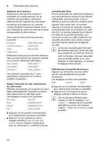 32 fr Mise en service Mise en service Généralités Ne verser, dans les conteneurs correspon- dants, que de l’eau pure, froide , sans gaz carbonique et uniquement du café en grains torréfié . Ne pas employer des grains de café avec glaçage, des grains caramélisés ou enrobés d’une substance sucrée quel...
