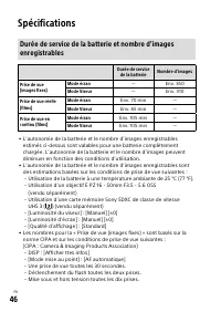 ILCE-65004-690-670-41(1) C:\4690670411ILCE6500CEC\02FR-ILCE6500CEC\120OTH.indd2016/09/30 16:27 FR 46 Spécifications Durée de service de la batterie et nombre d’images enregistrables Durée de service de la batterie Nombre d’images Prise de vue (images fixes) Mode écran ― Env. 350 Mode Viseur ― Env. 3...
